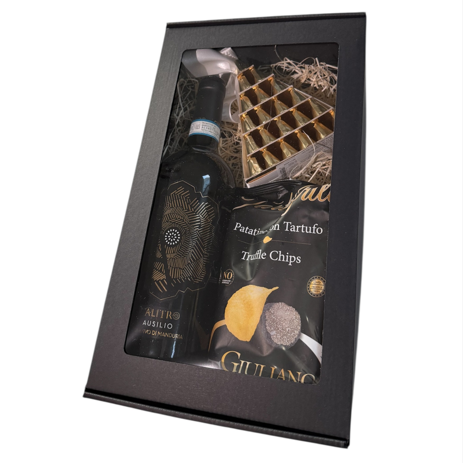 Kinkekomplekt sisaldab 1 pudeli veini Calitro Ausilio Primitivo di Manduria DOP 2022, Gianduiotti kommide kuldne püramiid 230 g ja pakk Tartufritte kartulikrõpsud trühvliga 45 g